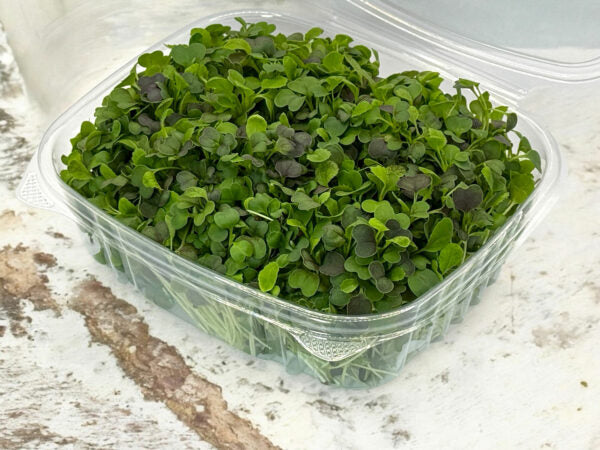 A tender, flavorful microgreen with mild cabbage-like sweetness and striking purple-green leaves — perfect for salads, bowls, dumplings, ramen, seafood, and refined modern plating.