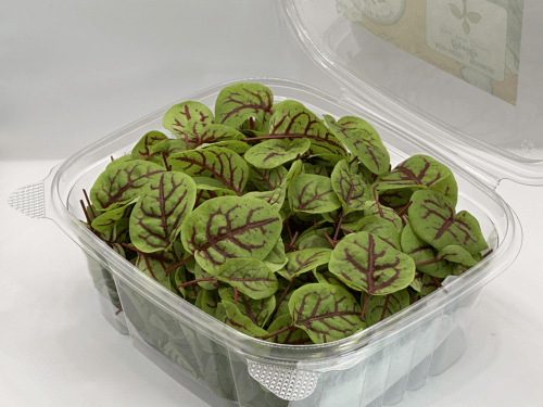 A visually stunning microgreen with electric lemony acidity, tender leaves, and bold red vein patterns — perfect for seafood, salads, desserts, cocktails, and modern artistic plating.