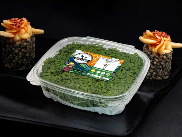 Wasabi Mustard microgreens feature bright green leaves and crisp stems — simple, clean, and highly expressive on the plate. Their minimalistic look makes them ideal for sushi bars, tasting menus, and refined Asian-forward dishes.